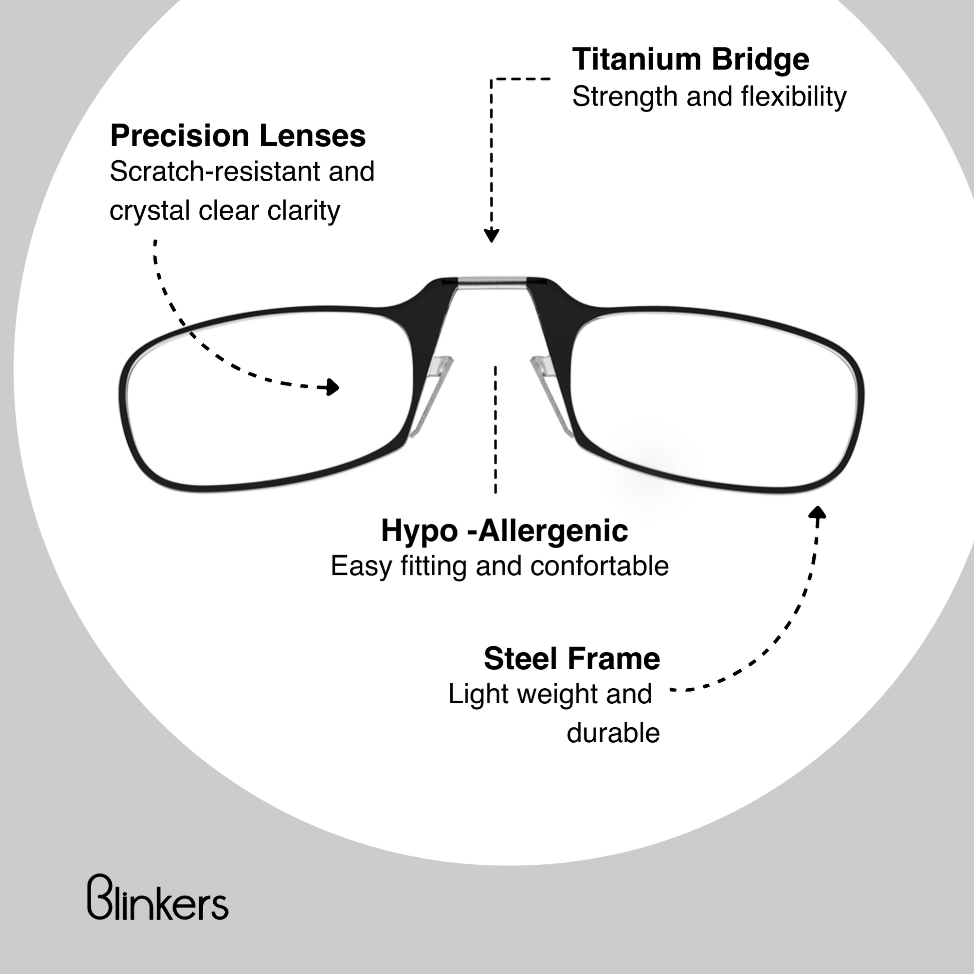 Here's where we get technical. Every Blinkers Mini Armless Reader is made of shatterproof, thermo-injection molded, optical-grade polycarbonate. The bridge is made from a shape-memory metal called Nitinol, which is 10x more elastic than spring steel and encased in medical-grade silicone tubing.